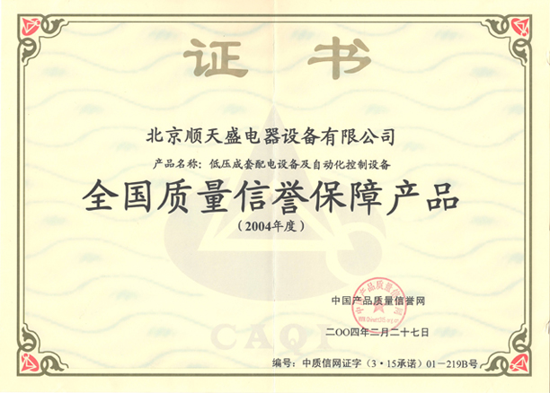 全國質(zhì)量信譽(yù)保障產(chǎn)品證書(shū)(2004)